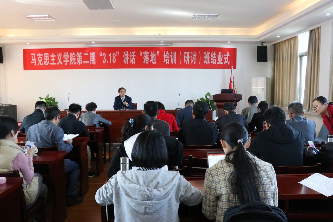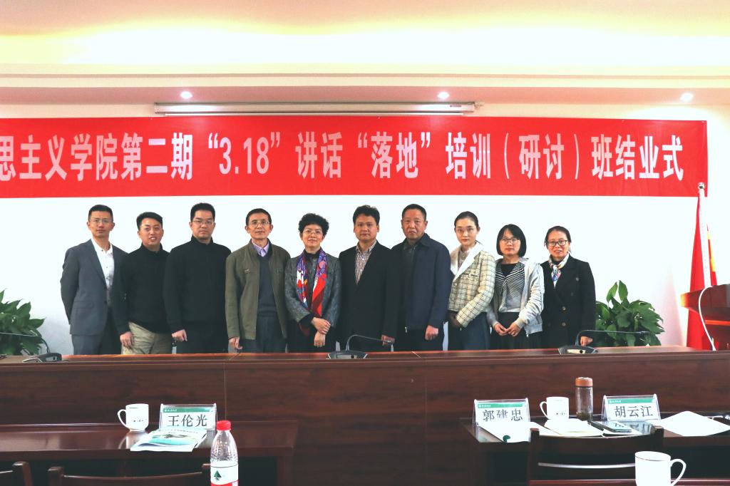 为深入贯彻习近平总书记在学校思想政治理论课教师座谈会上的讲话精神,推进我院“3.18”讲话“落地”培训工作持续进行,11月12日,马克思主义学院举行了第二期“3.18”讲话“落地”培训(研讨)班结业式。湖州师范学院人文社会科学研究院院长王伦光、校教务处处长郭建忠、教学督导组组长胡云江以及全国优秀教师雷家军出席活动,学院领导、全体教师及部分研究生同学参加了此次结业式。结业式由马克思主义学院院长高君主持。