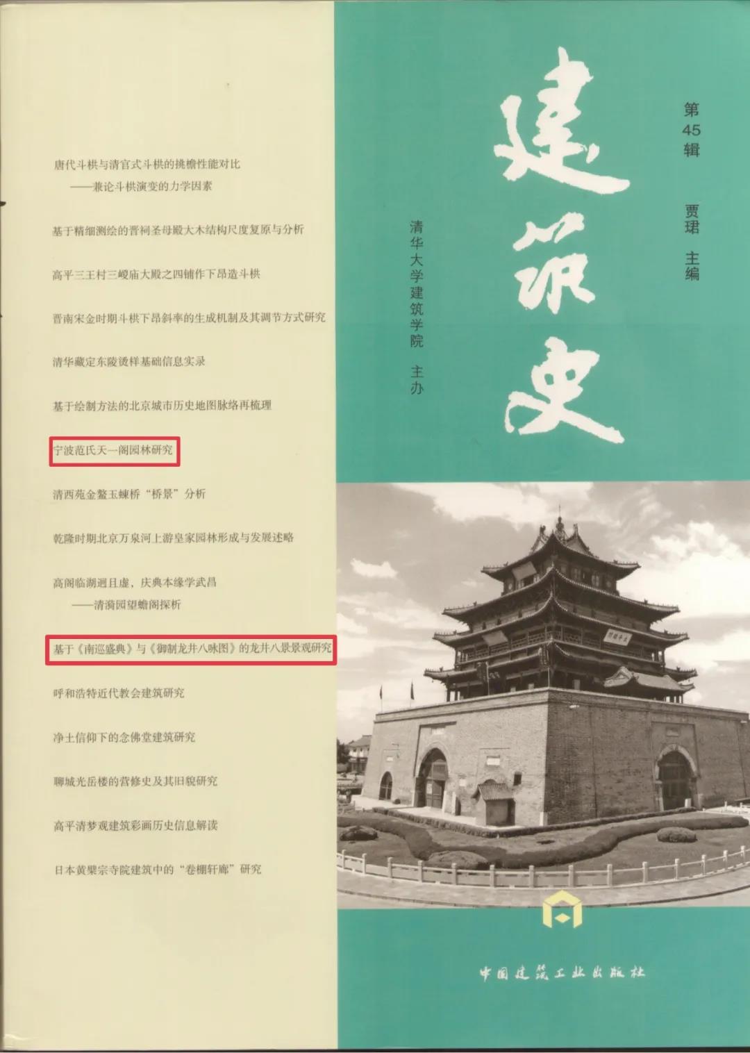 近日,园林学院研究生何嘉丽、陆嘉娴等撰写的两篇论文同时收入《建筑史》第45辑,是该辑除清华大学之外论文数量最多的院校。《建筑史》由清华大学建筑学院主办,是业界公认的建筑史研究最高出版物。两篇论文分别是由王欣老师指导的《宁波范氏天一阁园林研究》,和鲍沁星老师指导的《基于<南巡盛典>与<御制龙井八咏图>的龙井八景景观研究》。