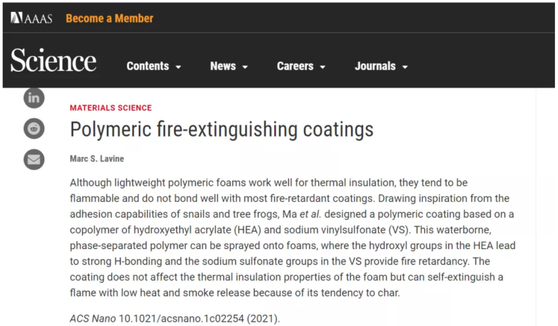马哲文和徐潇东作为共同第一作者撰写的论文“Bioinspired, Highly Adhesive, Nanostructured Polymeric Coatings for Superhydrophobic Fire-Extinguishing Thermal Insulation Foam”于2021年6月25日发表在化学与材料领域高水平国际期刊《ACS Nano》(IF=15.881)上,指导老师为澳大利亚南昆士兰大学宋平安教授。该研究论文被国际顶级学术期刊《Science》以“Polymeric fire-extinguishing coatings”为题在Editors’ Choice中进行推荐报道(http://science.sciencemag.org/content/373/6553/twil)。