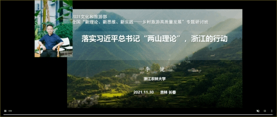 为深入贯彻落实习近平总书记发展文化和旅游的系列讲话精神,落实《中华人民共和国乡村振兴促进法》、《乡村振兴战略规划 2018-2022)》、《关于促进乡村旅游可持续发展的指导意见》,研判乡村文化和旅游发展面临的新形势、新任务,交流发达地区发展的新经验、新模式,探索研讨文化赋能、旅游激活,促进乡村振兴的新问题、新路径。11月30日—12月3日,国家文化和旅游部主办的“新理论、新思维、新实践——乡村旅游高质量发展” 专题研讨班在吉林培训基地成功举办。beat365官网园林学院李健副教授应邀在线为培训班进行《落实习近平总书记“两山理论”,浙江的行动》首场授课。
