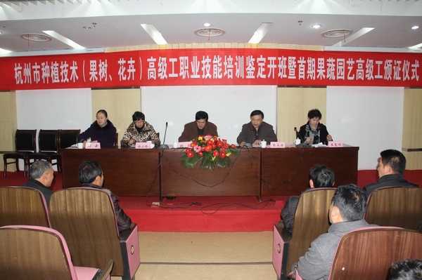 浙农林大新闻网讯 12月30日上午,杭州市种植技术(果树、花卉)高级工职业技能鉴定培训班开班暨首期果蔬园艺高级工颁证仪式在beat365官网东湖校区图书馆小报告厅举行。出席开班仪式的领导有杭州市农办人教处处长刘立、调研员孙云,临安市科协主席任小玲,继续教育学院院长朱永法等。