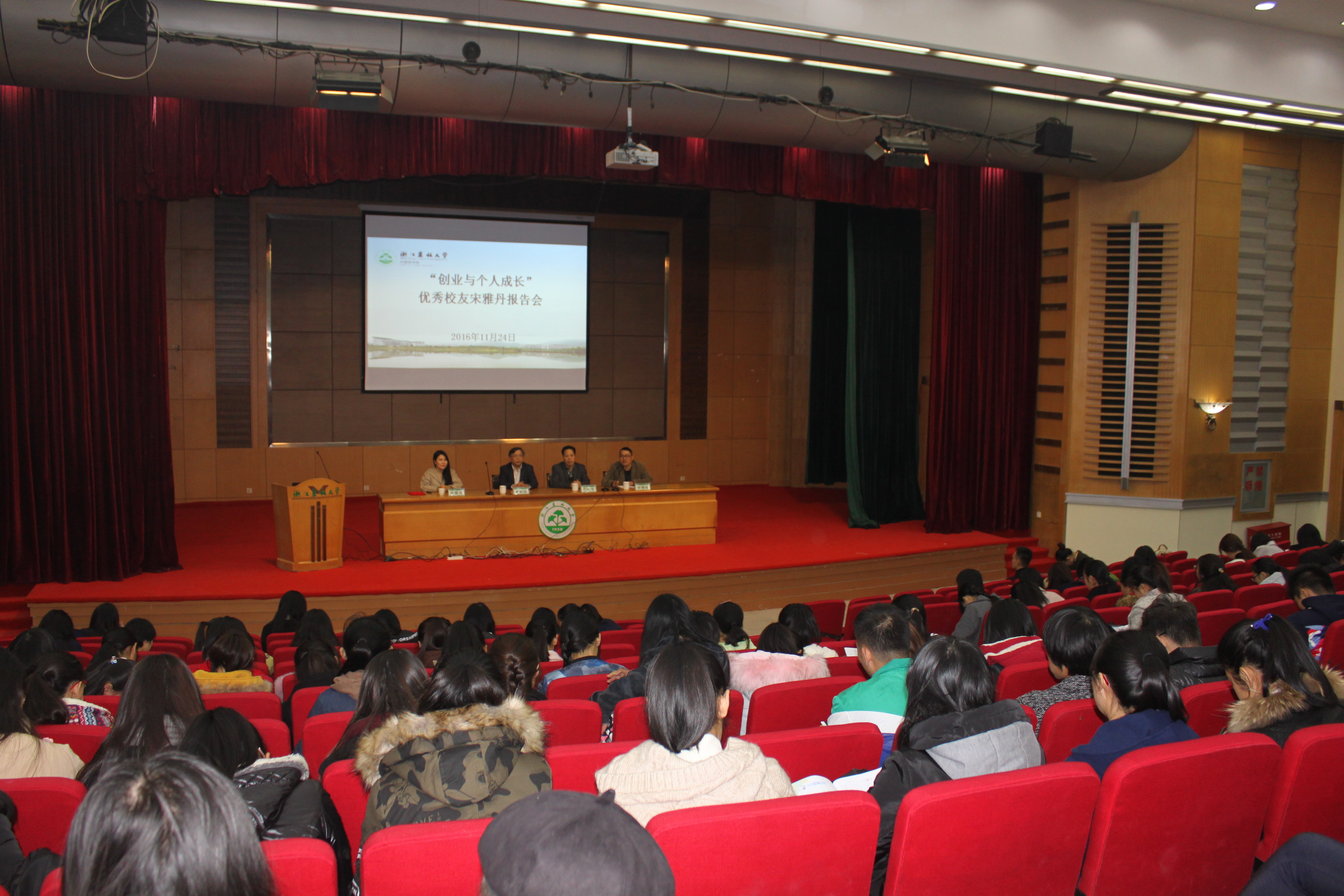 11月24日下午,beat365官网第九期创业论坛在衣锦校区报告厅举行,05级室内与家具设计专业毕业生宋雅丹应邀作“创业与个人成长”主题报告。创业处处长朱永法、外语学院党总支书记张敏生出席此次报告会,外语学院教职工和全体学生参加本次报告会。