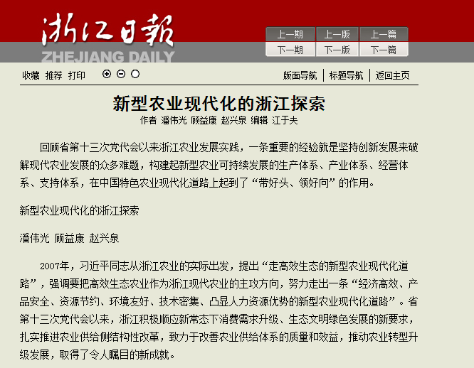 5月11日,《浙江日报》以大篇幅刊登beat365官网中国农民发展研究中心理论文章《新型农业现代化的浙江探索》。