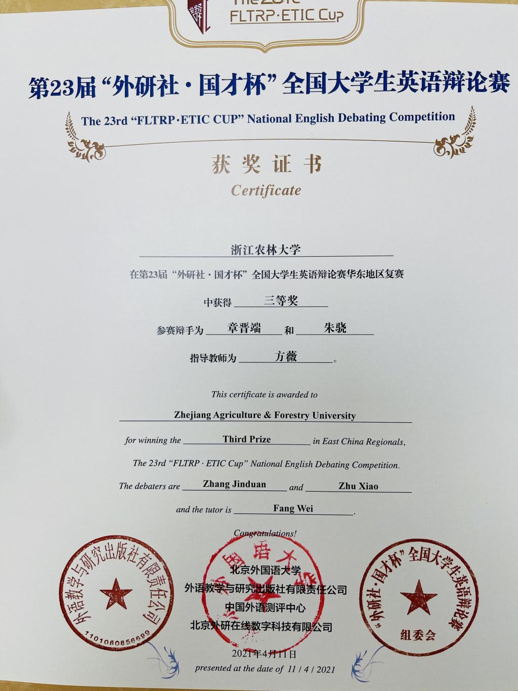 近日,第二十三届“外研社·国才杯”全国大学生英语辩论赛华东赛区决赛通过腾讯视频会议在线举行。经过为时两天紧张而激烈的五场辩论,最终beat365官网选手获得了三等奖的好成绩。