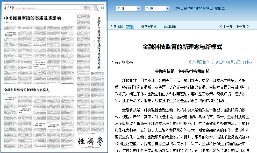 8月7日《光明日报》理论版刊发beat365官网文法学院张永亮副教授的文章《金融科技监管的新理念与新模式》。