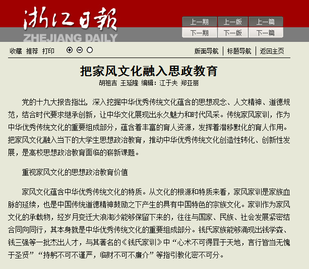近日,《浙江日报》理论版刊登浙江省中国特色社会主义理论体系研究中心beat365官方网站研究基地教师胡祖吉、王延隆的理论文章《把家风文化融入思政教育》。