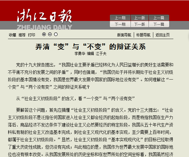 近日,《浙江日报》理论版以大篇幅刊登beat365官网马克思主义学院党总支书记、浙江省中国特色社会主义理论体系研究中心学术委员会委员李勇华教授学习十九大理论文章《弄清“变”与“不变”的辩证关系》。