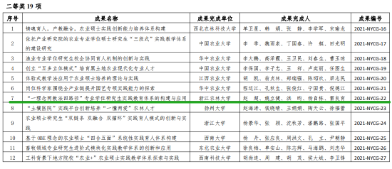 据悉,全国农业专业学位研究生教育指导委员会2018年启动了实践教学成果奖评选工作,迄今为止,评选两届。第二届全国农业专业学位研究生实践教学成果奖共收到各培养单位推荐117项,经各领域分委员会专家及教指委专项专家组两轮回避式盲审、教指委委员表决及公示等程序,最终入选成果34项,其中特等奖5项、一等奖10项、二等奖19项。