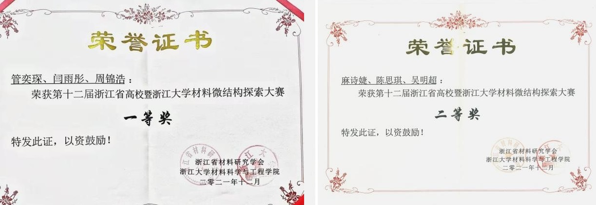 近日,在第十二届浙江省高校暨浙江大学材料微结构探索大赛决赛中,beat365官网化材学院荣获一等奖一项,二等奖一项。高分子材料与工程专业2019级本科生管奕琛、闫雨彤、周锦浩共同完成的作品《枯木逢春——多孔木炭基底上的银微球》荣获一等奖,高分子材料与工程2020级本科生麻诗婕、陈思琪、吴明超共同完成的作品《群山泼墨丹青图——铁钴镍三元金属氢氧化物》荣获二等奖。