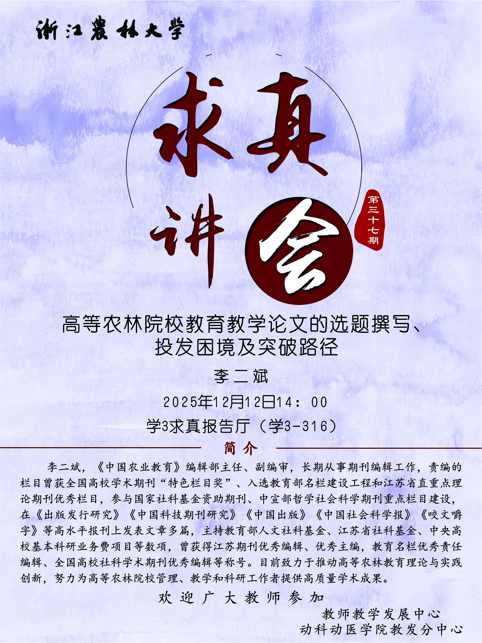 讲座预告:第三十七期“求真讲会”:高等农林院校教育教学论文的选题撰写、投发困境及突破路径