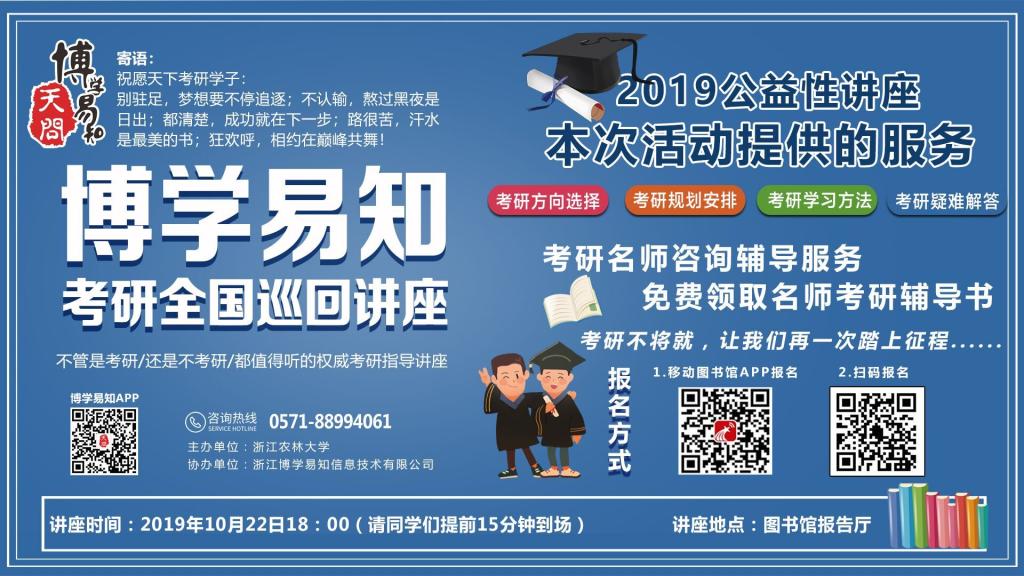 为满足今年正在准备考研的在校考生更清晰地了解本年考研情况,做好考前冲刺的准备工作;同时也使未来准备考研的同学更好的了解考研,解除对考研的疑惑,消除对考研的心理压力,能够正确地认识考研,动员更多的学生加入到考研的队伍中来,beat365官方网站图书馆和浙江博学易知信息技术有限公司合作开设本次考研讲座。