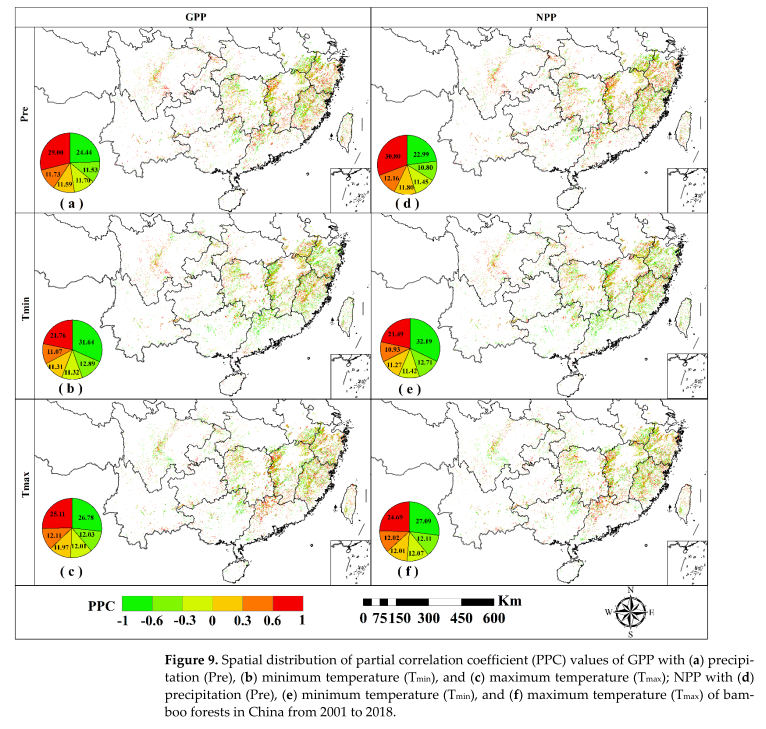 气候对竹林碳通量时空动态演变影响研究表明,在年尺度上,通过计算竹林GPP、NPP与气象因子(最高温、最低温、降水量)的偏相关系数发现,整体上,竹林GPP、NPP与降水量呈正相关,而与最高温、最低温均呈负相关,即高温或低温在一定程度上抑制了竹林碳通量的增加,而适宜的降水量促进竹林碳通量的增加。在月尺度上,温度和降水与竹林GPP、NPP呈显著相关关系,相关系数均达0.56以上。