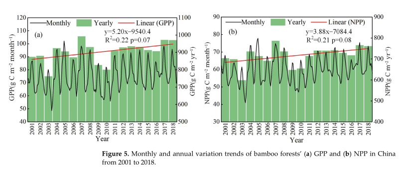竹林是我国亚热带地区重要且特殊的森林资源,由于其分布范围广、生长速度快、固碳能力强等特点,在调节全球碳平衡等方面发挥着重要的作用。本研究以中国竹林为研究对象,以中国竹林遥感分布信息、竹林LAI同化数据产品和土壤、气象等数据等驱动BEPS模型,模拟2001-2018年近20年中国竹林GPP和NPP,并分析了GPP、NPP时空演变格局及其对气候因子的响应。