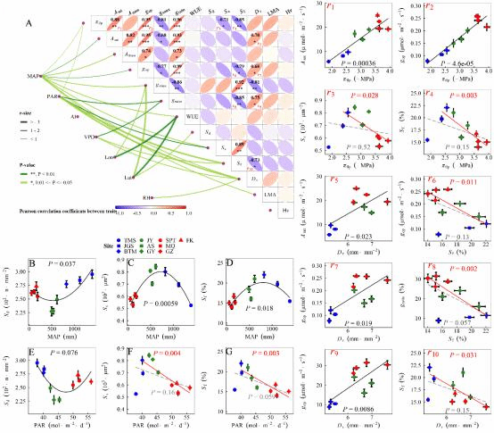 性状协作网络是由相互关联的功能性状构建而成,能够反映基于性状的适应策略。然而,对协作网络跨空间尺度的变化特征,以及哪些驱动因素和机制调节了这种变化仍然不清楚。本研究以广布种——西伯利亚榆树(Ulmus pumila)为研究对象,沿中国东南湿润区(潮湿森林)到西北干旱区(干旱荒漠)设置3800公里的研究样带(该样带垂直于降水梯度;Fig. 1A),通过将光合、气孔解剖、气孔功能、叶经济谱和水分相关性状整合为一个协作网络(Fig. 1B),填补了上述研究空白。
