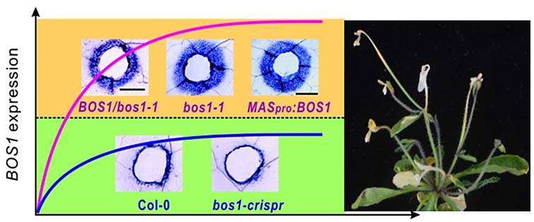 植物在抗病和发育过程中,通过细胞程序性死亡的启动,来形成一个死亡区域。该区域可以是一片细胞死亡的病斑,从而将病菌限制在病斑中,避免病害扩散;也可以是几层细胞死亡,形成导管或花药的开裂层,是完成植物生命活动的必要环节。细胞死亡研究的难点在于死亡时间点的不可控性,研究中常用光、病菌来诱导细胞死亡,无法精确的预测死亡的时间和地点,只能在细胞死亡出现后,研究一些后期的表型。本研究发现了一个转录因子BOS1,可以在高表达时启动细胞死亡程序,通过外伤激活表达的诱导表达株,文章成功在叶片伤口的周围诱导出持续的细胞死亡面积,实现了哪里有外伤哪里就有细胞死亡发生,实现了细胞死亡时间和地点的精确控制。