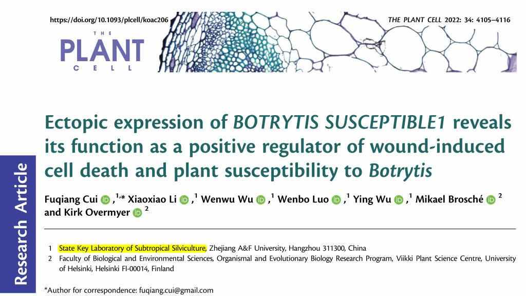 近日,国家重点实验室崔富强副教授以“Ectopic expression of BOTRYTIS SUSCEPTIBLE1 reveals its function as a positive regulator of wound-induced cell death and plant susceptibility toBotrytis”为题发表在国际权威学术期刊《The Plant Cell》(中科院1区Top,IF5-yr=12.796)。该研究揭示植物细胞死亡和易感的调控机制,并阐明了细胞死亡调控因子MYB108的功能。崔富强副教授为论文第一作者和通讯作者,国家重点实验室为第一单位。