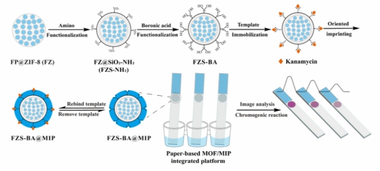 该研究提出了一种新的策略来整合MOFs、纸基微流控芯片、侧向流动分析和硼酸盐亲和表面定向印迹,以制备纸基MOF/MIP集成平台,实现了牛奶和水产品中卡那霉素残留的快速、灵敏、可视化检测,该平台具有较低的检测限、良好的选择性和稳定性。该研究是基于仿生识别开展的快速分析研究一项重要阶段性成果,首次尝试建立一个基于纸张的MOF/MIP集成平台,发展出一种新型的仿生识别微流控试纸,用于氨基糖苷类化合物的快速检测,具有良好的商业应用潜力。