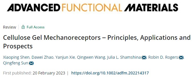 2023年2月20日,林业工程学科生物质仿生智能研究团队青年教师教师沈晓萍以第一作者在材料科学领域国际期刊《Advanced Functional Materials》(中科院1区Top,IF=19.924)在线发表题为“Cellulose gel mechanoreceptors - principles, applications and prospects”(木质纤维素凝胶基智能机械感受材料-原理、应用及展望)的综述论文。通讯作者为美国得克萨斯理工大学Julia L. Shamshina助理教授、美国阿拉巴马大学Robin D. Rogers教授和beat365官方网站孙庆丰教授。beat365官方网站化学与材料工程学院为该论文第一单位和通讯作者单位。