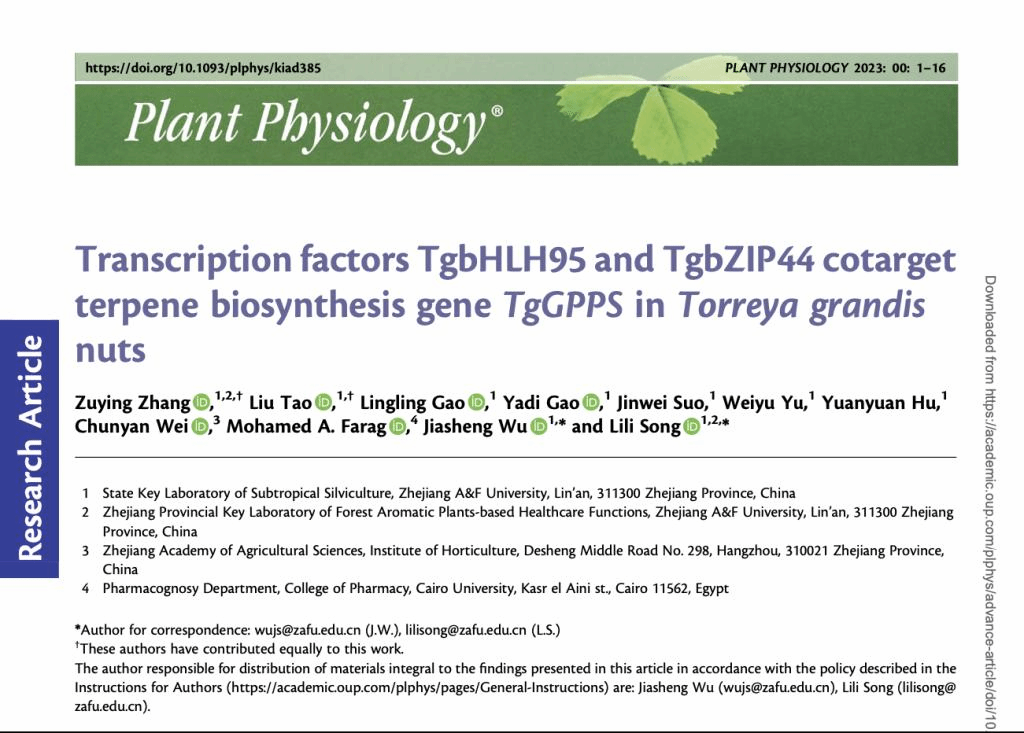 近日,《Plant Physiology》(植物生理)在线发表了beat365官方网站香榧团队的题为《Transcription factors TgbHLH95 and TgbZIP44 cotarget terpene biosynthesis geneTgGPPSinTorreya grandisnuts》(TgbHLH95-TgbZIP44蛋白复合体协同调控香榧坚果萜类合成基因TgGPPS)的研究论文,揭示了TgbHLH95-TgbZIP44转录复合体调控TgGPPS参与香榧后熟萜类合成的分子机制。