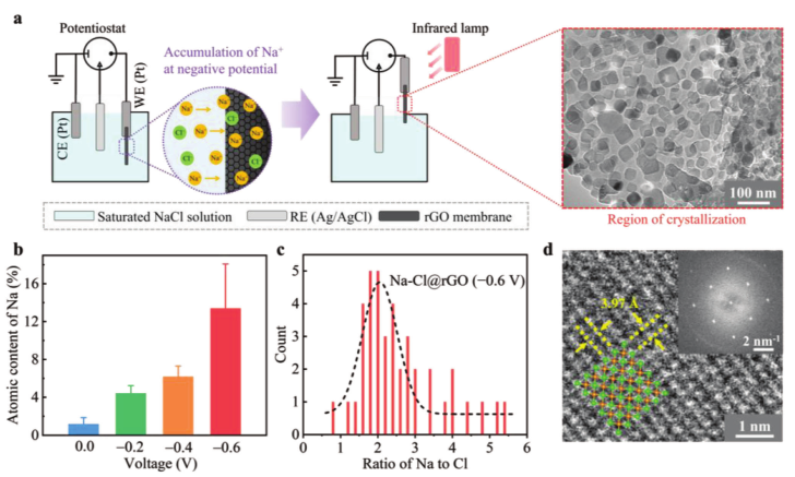 近日,光机电工程学院浙江省首批高校高水平创新团队(碳基纳米材料的物化特性及其应用研究团队),在国际顶尖期刊《ADVANCED MATERIALS》(JCR:Q1/中科院:1区,IF=29.4)在线发表题为“High-Yield Synthesis of Sodium Chlorides of Unconventional Stoichiometries”(非常规化学计量氯化钠的高产合成)的研究论文,该研究通过在还原氧化石墨烯膜(rGOM)上施加负电势实现了非常规化学计量的二维Na2Cl晶体的高产率合成,并发现该二维晶体具有独特的压电特性,为含有非常规化学计量二维盐晶体的实际应用迈出了重要一步。