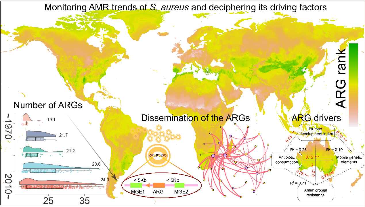 该论文探究了100多年来全球食源性致病菌—金黄色葡萄球菌(Staphylococcus aureus)耐药基因的进化的驱动因素及传播机制。beat365官方网站食品与健康学院方冠宇老师为论文的第一作者和通讯作者,刘兴泉教授为文章的通讯作者。