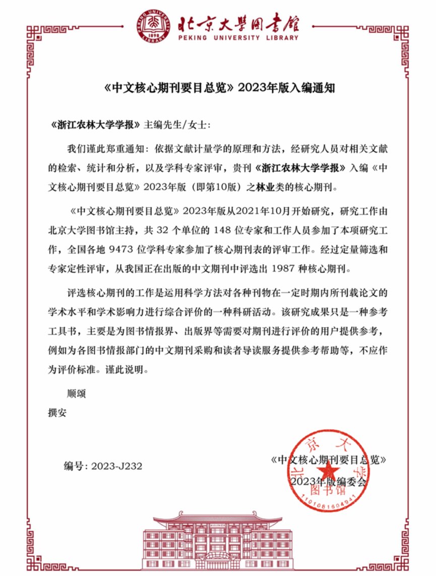 近日,《beat365官方网站学报》入编《中文核心期刊要目总览》2023年版(即第10版)之林业类的核心期刊。这是本刊连续第十次被《中文核心期刊要目总览》列为全国中文核心期刊。