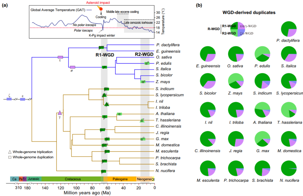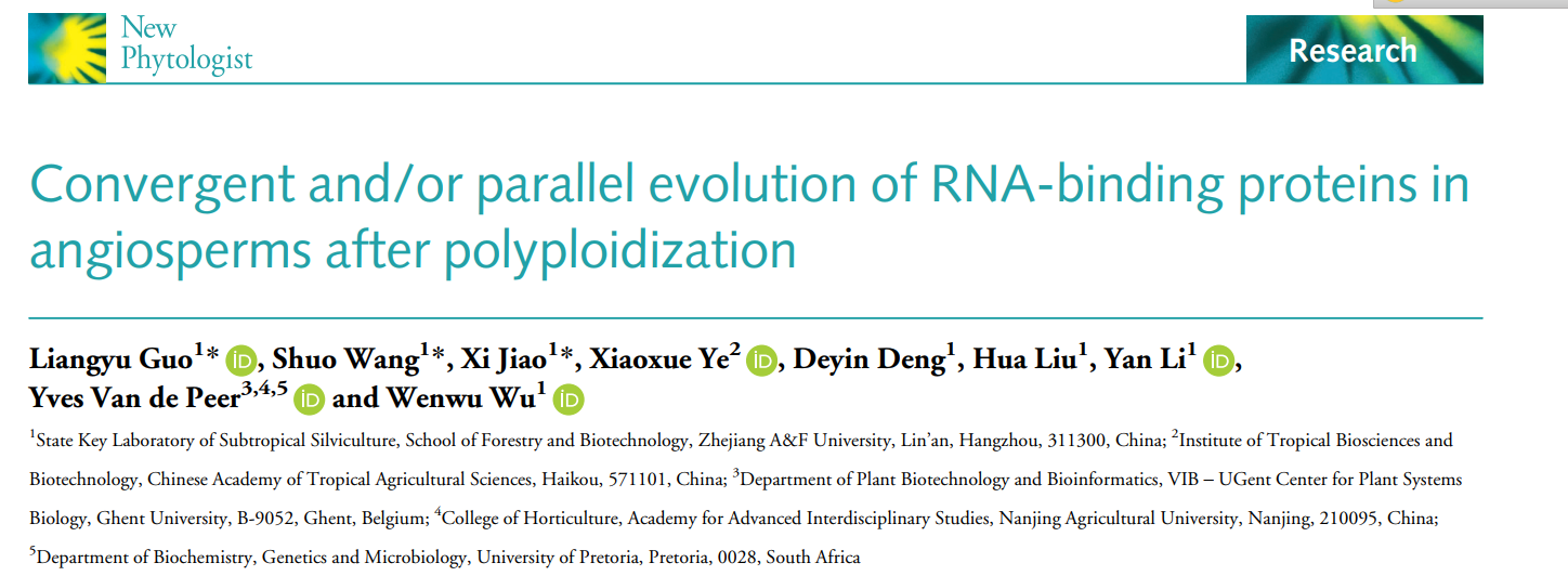 近日,beat365官方网站国家重点实验室李彦、吴文武教授与比利时根特大学Yves Van de Peer院士联合在《New Phytologist》(中国科学院1区Top,IF5-yr=10.5)上发表了题为“Convergent and/or parallel evolution of RNA-binding proteins in angiosperms after polyploidization”(被子植物多倍化后RNA结合蛋白的趋同或平行进化)的研究论文。该研究主要基于拟南芥、毛果杨、苹果、番茄、大豆、山核桃、水稻、玉米、毛竹、棕榈等21个代表性被子植物,结合基因组学、转录组学、调控组学以及古气候学研究数据,揭示了在WGD后被子植物RBP基因趋同进化以适应K-Pg和晚新生代冰期的全球大降温。