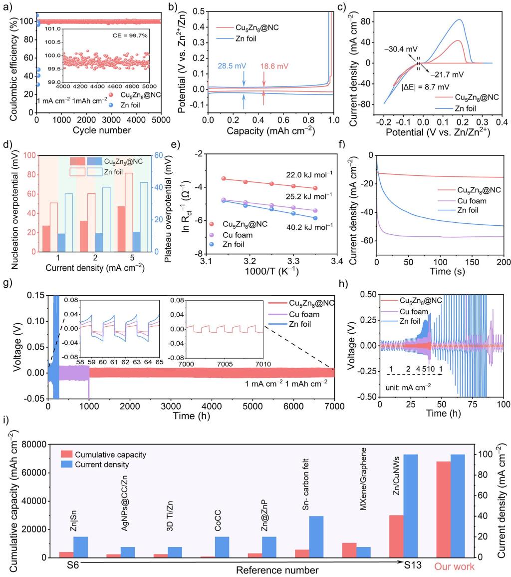 基于此,胡勇教授课题组报道了在泡沫铜上开发核壳纳米棒阵列稳定锌负极。该纳米棒阵列由氮掺杂碳包覆Cu5Zn8合金组成(Cu5Zn8@NC)。内层Cu5Zn8合金具有较小的成核能垒,可作为优先成核位点。分层阵列作为保护层,可容纳高容量的镀锌,通过“先捕获后填平”机制引导锌沉积。所得的保护层在均匀界面离子通量和降低局部电流密度方面起着重要的作用。优化后的Cu5Zn8@NC负极在5000次镀锌/剥离循环中库仑效率高达99.7%。对称电池在1 mA cm–2和1 mAh cm–2下具有7000小时的超长循环寿命,过电位仅为16.5 mV。组装的锌离子全电池在10000次充放电循环后,容量保持率高达89.2%。