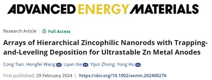 近日,化材学院胡勇教授等人在国际顶尖期刊《Advanced Energy Materials》(中科院1区Top,IF=27.8)在线发表题为《分层亲锌纳米棒阵列通过先捕获后填平沉积实现超稳定锌负极》(Arrays of hierarchical zincophilic nanorods with trapping-and-leveling deposition for ultrastable Zn metal anodes)的研究论文,证明了由氮掺杂碳包覆Cu5Zn8合金构筑的核壳纳米棒阵列(Cu5Zn8@NC)可以均匀负极界面离子通量并降低局部电流密度,实现超长的镀锌/剥离循环。