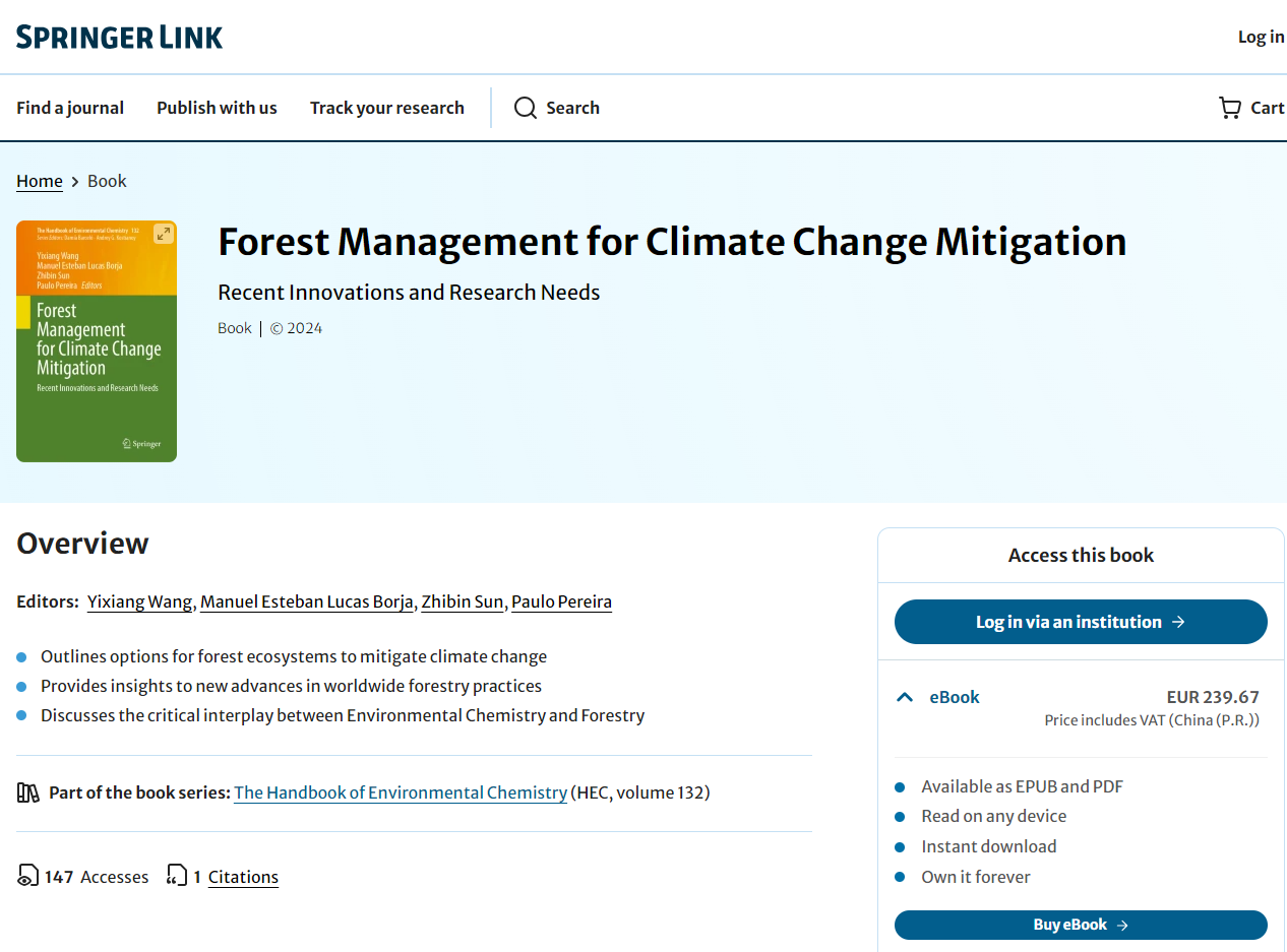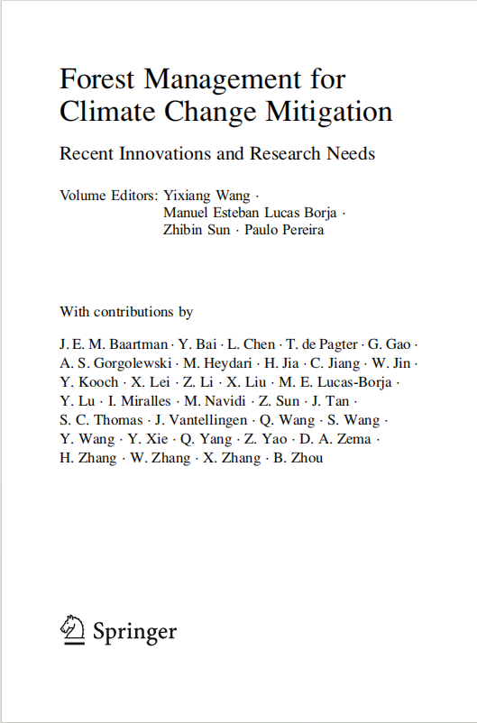 近日,beat365官方网站环境与资源学院、碳中和学院王懿祥教授在国际著名出版社——SpringerPress(斯普林格出版社)出版英文林业专著《Forest Management for Climate Change Mitigation-Recent Innovations and Research Needs》。该书以精装本的形式面向全球发行,并在谷歌电子书店上线和在亚马逊上架,同步进入Springerlink平台数据库。