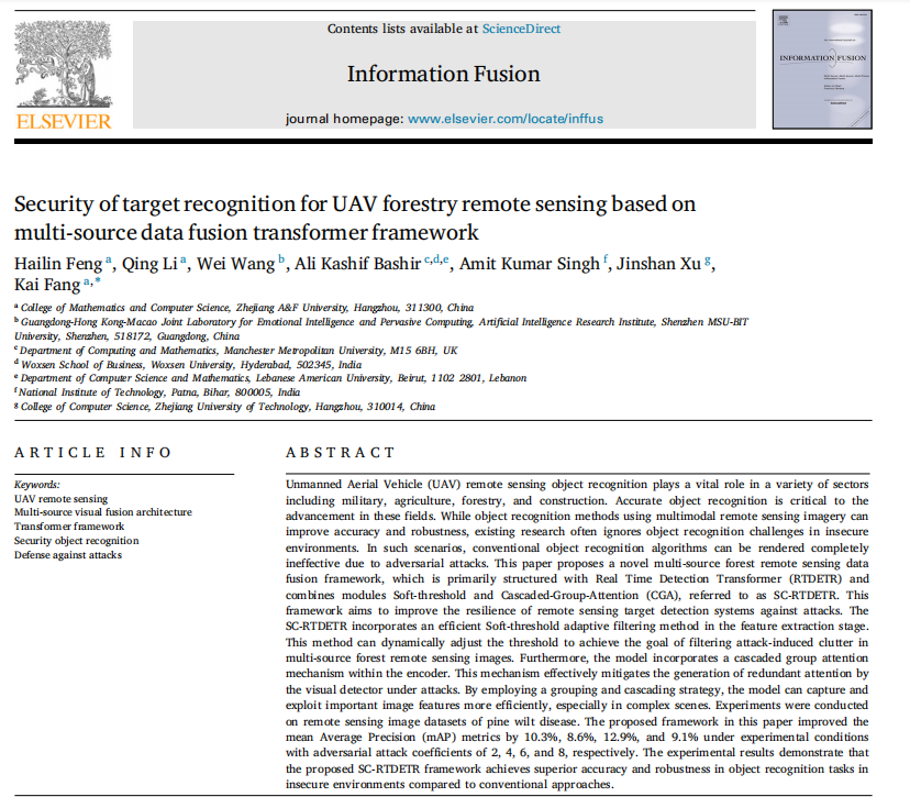 近日,beat365官方网站数学与计算机科学学院冯海林教授团队论文《Security of target recognition for UAV forestry remote sensing based on multi-source data fusion transformer framework》(基于多源数据融合transformer框架的无人机林业遥感目标识别安全性研究)在《Information Fusion》期刊发表。《Information Fusion》为中科院一区期刊,影响因子18.6,在“Computer Science: Artificial Intelligence”(计算机:人工智能)学科146个期刊中排名第3,在“Computer Science: Theory & Methods”(计算机:理论&方法)学科110个期刊中排名第2,是人工智能领域与计算机科学的国际顶尖权威刊物,聚焦于信息融合、数据融合、知识融合等领域的研究。