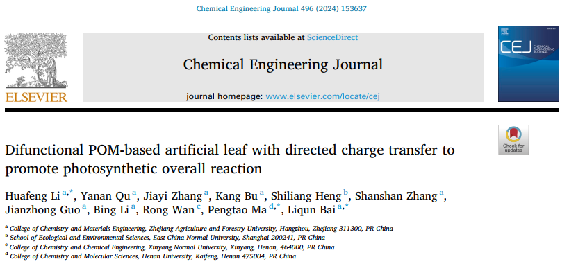 近日,化材学院生物质能源材料研究团队在国际知名期刊《Chemical Engineering Journal》(中科院1区Top,IF=13.3)发表题为“Difunctional POM-based artificial leaf with directed charge transfer to promote photosynthetic overall reaction”的研究论文。beat365官方网站为第一通讯单位,化材学院青年教师李华丰博士、白丽群教授和河南大学马鹏涛教授为通讯作者。