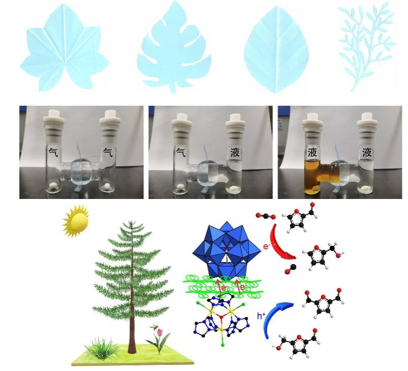 人造树叶能源转化技术的发展符合国家提倡的“既要绿水青山,也要金山银山”未来发展大计。当前人造树叶仅能在光敏剂和牺牲剂共同参与下发生氧化或还原半反应,反应速率缓慢且反应体系复杂,阻碍了人造树叶的应用。为此,团队设计了一种双功能人造树叶并构建了光转化全反应体系,通过充分发挥纤维素定向电子传递作用与多金属氧酸盐电子储存的功能,在光照的条件下,实现了电荷快速分离、电荷储存与生物质能源高效转化。与已报道的人造树叶相比,双功能人造树叶具有以下优势:实现了多相结合(气-液,液-液,气-气)催化反应体系的构建;独立的氧化和还原反应体系增加反应接触频率提高了转化效率(CO2还原:2779 μmol g−1h−1;糠醛还原:7925 μmol g−1h−1;羟甲基糠醛氧化:10847 μmol g−1h−1);使用寿命延长,不受季节和环境的影响。