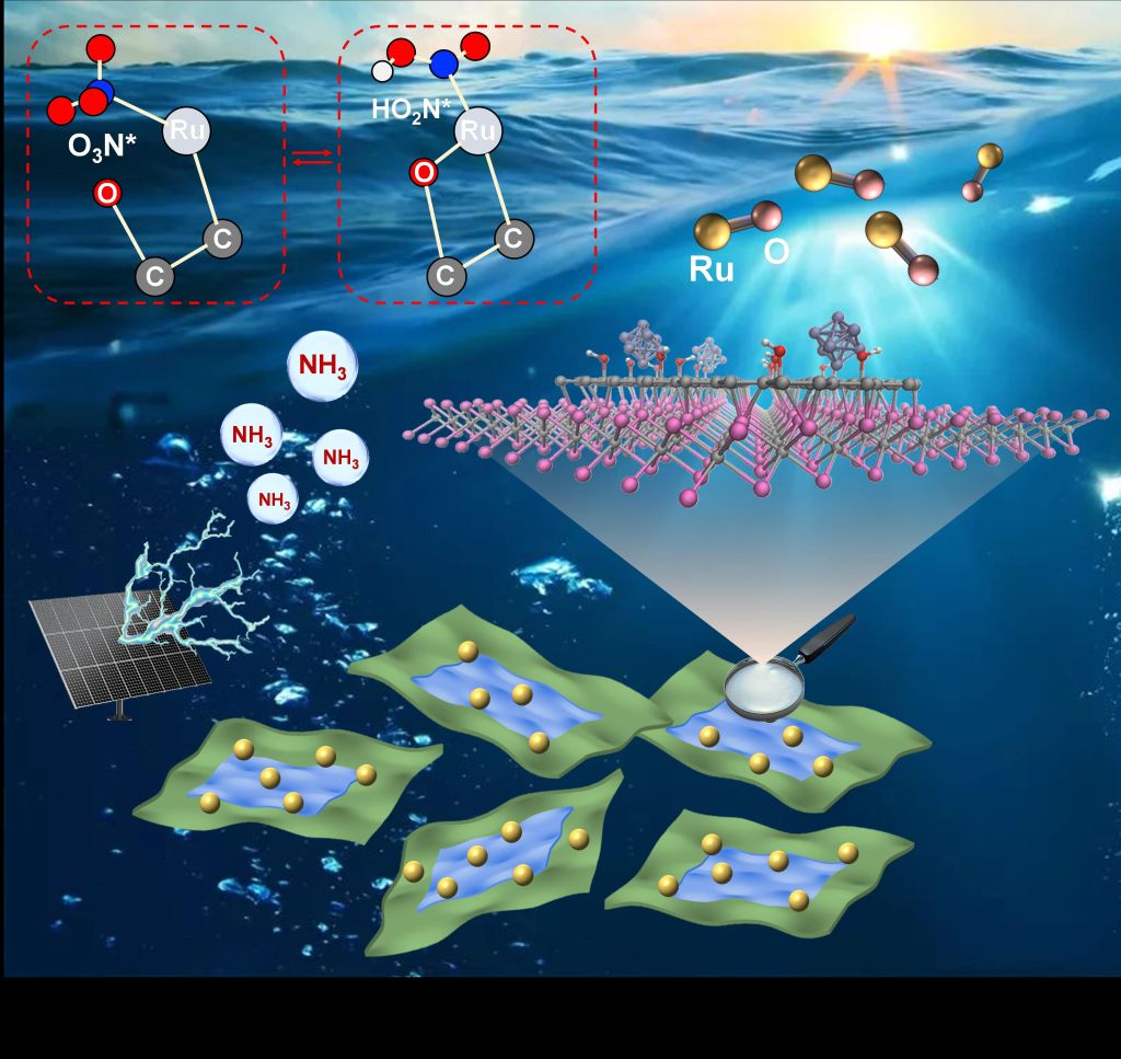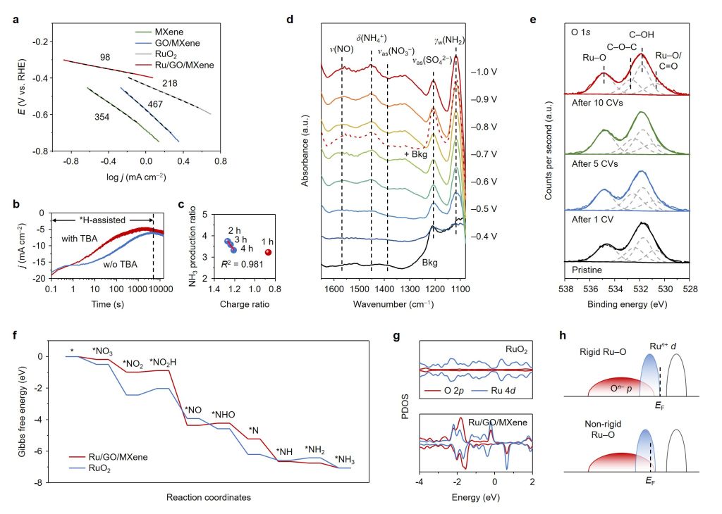 研究制备的Ru/GO/MXene在−0.8 V vs. RHE时表现出卓越的NH3产率,超过5 mg h−1 cm−2,实现几乎100%的NH3−法拉第效率,远远超过大多数报道的钌基催化剂材料。XPS和ATR-FTIR证实Ru/GO/MXene中的Ru−O共价键具有动态和自修复特性,这在促进硝酸根转化为氨的催化过程中起着关键作用。之后的理论研究进一步揭示了Ru−O键的非刚性以及它们如何自我调节以适应硝酸还原反应中涉及的各种中间体。这项工作提供了一种制造具有可逆和非刚性金属−氧键的高性能电催化剂的方法,为实际废水中的硝酸根电解开辟了新的可能性。