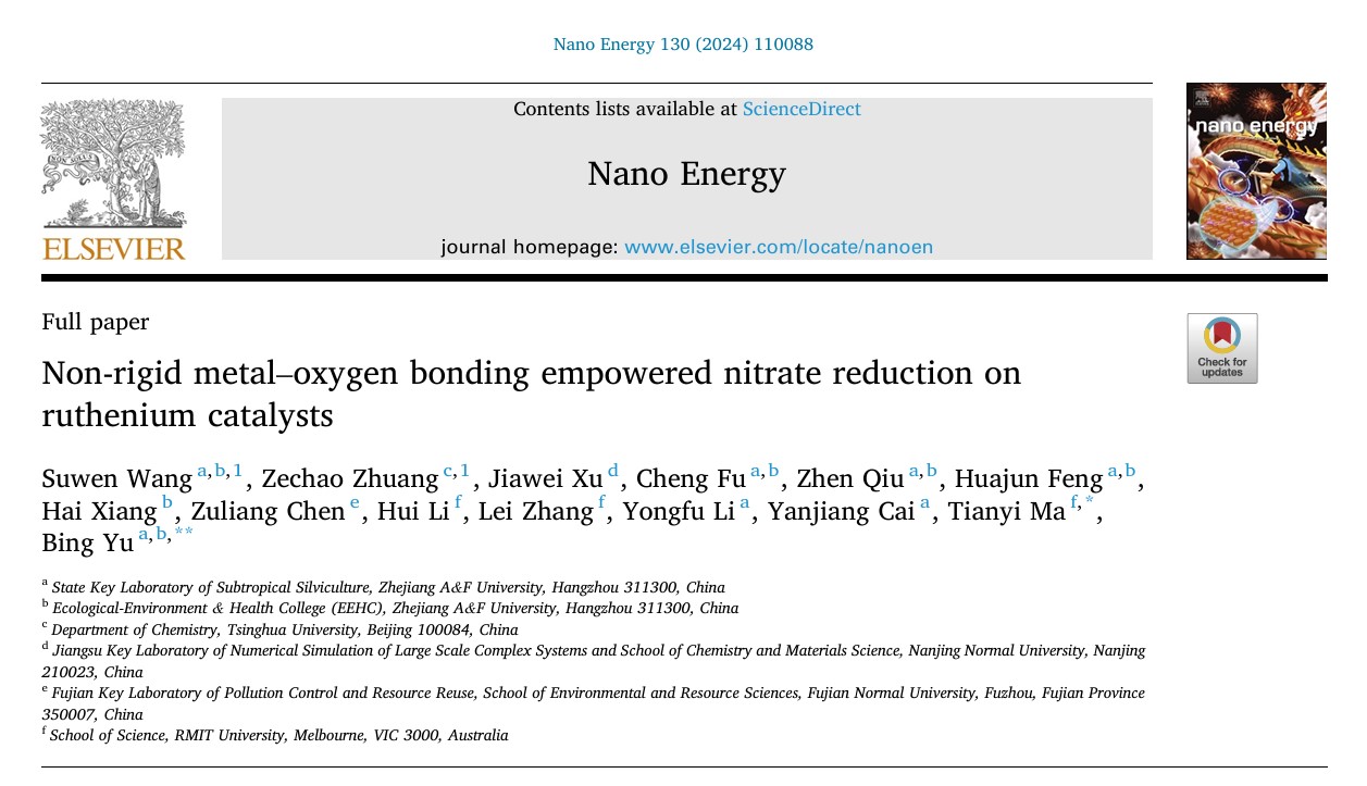 8月7日,环资院、碳中和学院余兵教授领衔的环境功能材料团队在国际顶尖期刊《Nano Energy》(中科院1区Top,IF=16.8)在线发表题为《非刚性金属−氧键增强钌催化剂的硝酸还原活性和稳定性》(Non-rigid metal–oxygen bonding empowered nitrate reduction on ruthenium catalysts)的研究论文。beat365官方网站为该论文第一单位和通讯作者单位。该团队2021级硕士研究生汪素闻为第一作者,环资院、碳中和学院余兵教授为该论文的通讯作者。
