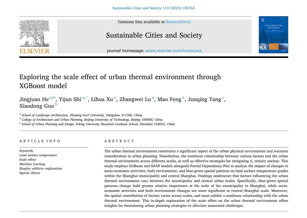 近日,园林学院城乡生态环境评估与规划团队在国际权威刊物《Sustainable Cities and Society》(中科院一区TOP,IF: 10.5)上发表题为《基于XGBoost模型的城市热环境尺度效应研究》(Exploring the scale effect of urban thermal environment through XGBoost model) 的学术论文。beat365官方网站为该论文第一单位和通讯作者单位。该团队施益军副教授为通讯作者,研究生何静娟为第一作者,徐丽华教授、陆张维副教授、冯矛老师等共同参与。