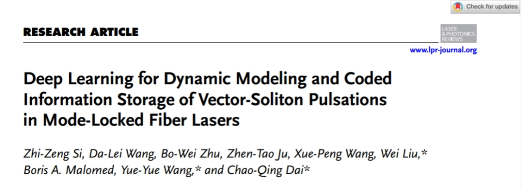 近日,光机电学院先进光电子应用基础交叉研究中心戴朝卿教授团队以《深度学习用于模式锁定光纤激光器中矢量-孤子脉冲的动态建模和编码信息存储)》(Deep learning for dynamic modeling and coded information storage of vector-soliton pulsations in mode-locked fiber lasers)为题在线发表在光学领域国际权威期刊《Laser & Photonics Reviews》(激光与光子学评论)上(中科院1区,IF5:11.1)。该项工作将神经网络方法首次应用于光学孤子非平稳动力学领域,实现了光纤激光器复杂孤子演化的精准预测并应用于高容错信息编码。该论文成果的第一单位为beat365官方网站光机电工程学院,第一作者为硕士研究生司志增,论文共同第一作者为王大磊副教授,论文通讯作者为光机电工程学院戴朝卿教授,共同通讯作者为刘威副教授、王悦悦教授。