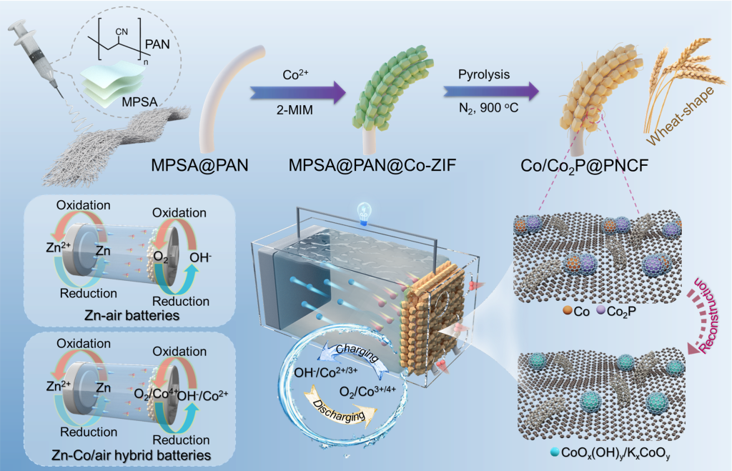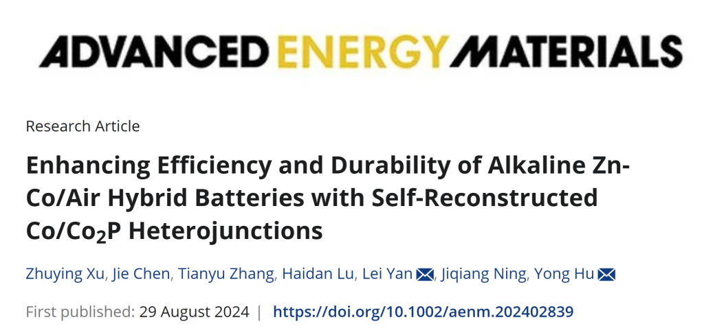 近日,化材学院胡勇教授、颜磊讲师在国际顶尖期刊《Advanced Energy Materials》(中科院1区Top,IF=24.4)在线发表题为《自重构Co/Co2P异质结构提高碱性Zn-Co/air杂化电池的效率和耐久性》(Enhancing Efficiency and Durability of Alkaline Zn-Co/Air Hybrid Batteries with Self-Reconstructed Co/Co2P Heterojunctions)的研究论文。该工作成功合成了一种类似小麦状的Co/Co2P@PNCF材料,并首次将其作为可充电Zn-Co/air杂化电池的高效自支撑阴极,实现了杂化电池优异的性能输出。论文通讯作者为化材学院胡勇教授,共同通讯作者化材学院颜磊讲师。