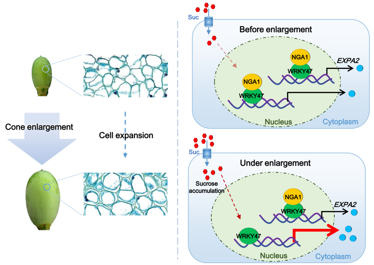 该研究采用13C标记和蔗糖处理等试验,明确了蔗糖诱导的细胞体积增大对香榧球果膨大具有重要作用。通过转录组测序、基因功能验证等手段,证实了香榧扩张蛋白基因TgEXPA2可正向调节细胞扩张促进球果膨大。进一步研究发现转录因子TgWRKY47通过直接结合到TgEXPA2启动子而增强其表达。此外,研究还发现,NGATHA转录因子TgNGA1直接与TgWRKY47相互作用,从而抑制TgWRKY47对TgEXPA2的调控作用。综上所述,我们的研究结果揭示了蔗糖与香榧球果膨大之间的关联,并阐明了分子调控机制。