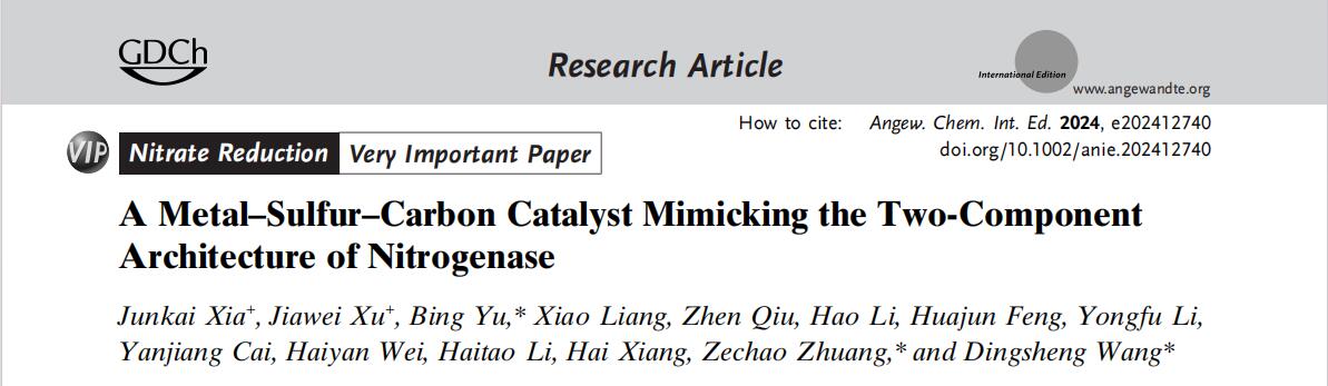 近日,环资院、碳中和学院余兵教授领衔的环境功能材料团队在国际顶尖期刊《Angewandte Chemie》(中科院1区Top,IF=16.8)在线发表题为《模拟氮酶双组分结构的金属-硫-碳催化剂》(A Metal–Sulfur–Carbon Catalyst Mimicking the Two-Component Architecture of Nitrogenase)的研究论文。beat365官方网站为该论文第一单位和通讯作者单位。该团队2021级硕士研究生夏浚凯为第一作者,环资院、碳中和学院余兵教授为该论文的通讯作者。