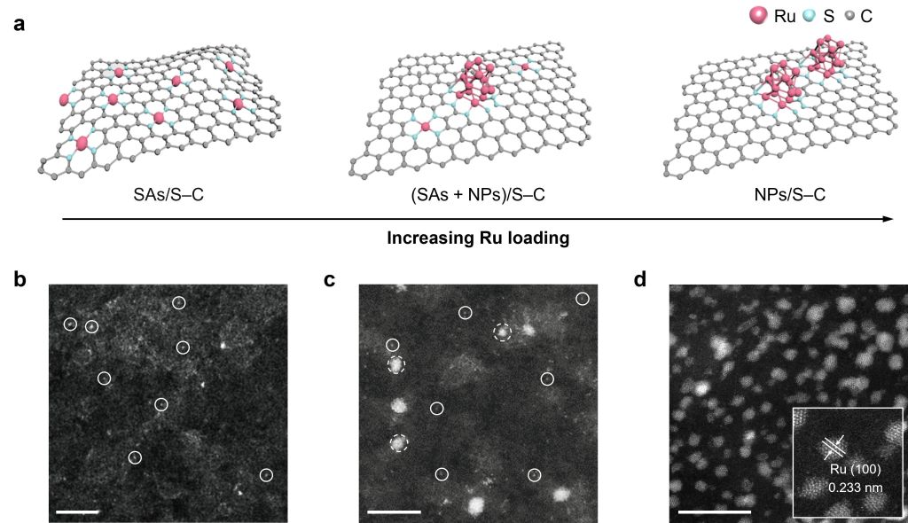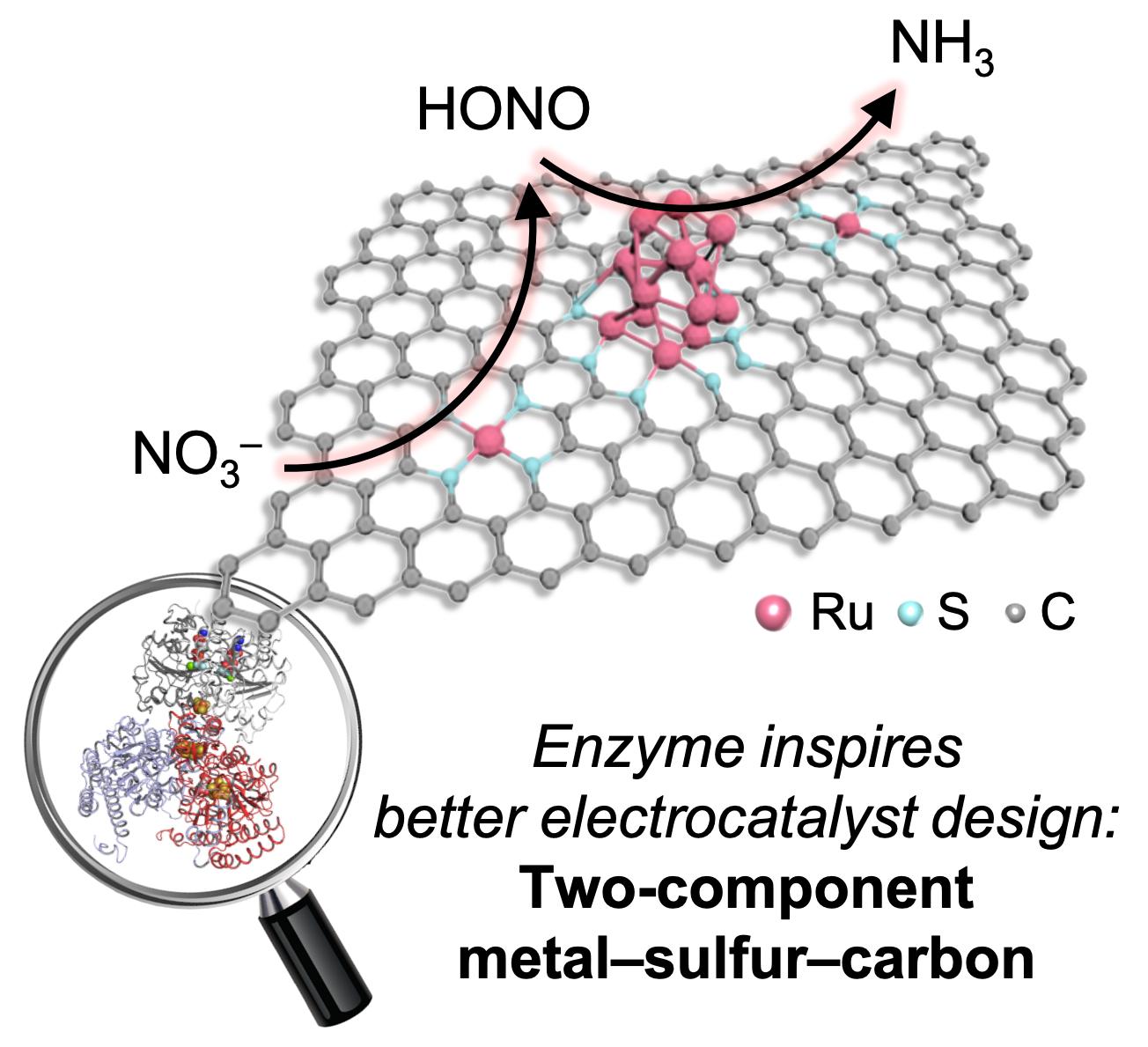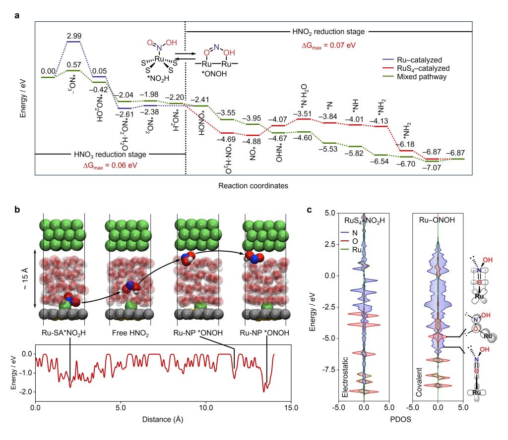 该团队设计了一种由两种酶的结构酶学启发的双组分M-S-C催化剂,并通过表征和机制探究实验进一步探索了其结构依赖性,以通过电化学硝酸还原(NitRR)合成氨。我们观察到,只有当Ru SAs和NPs共存时,催化剂才能达到最高性能。这种(SAs + NPs)/S-C表现出显著的NH3产率约为~37 mg L-1h-1和法拉第效率约为~97%,持续超过200小时,并且超过了大多数报道的电催化剂。实验和理论研究揭示了Ru SAs与S配位在促进HONO中间体的形成和随后在相邻Ru NPs上的还原反应中的关键作用。因此,S-C负载的NPs与SAs之间的协同作用与双组分氮化酶催化作用表现出显著的相似性。这项工作扩展了SACs的构型空间的限制,并有助于氨合成催化剂的合理设计。