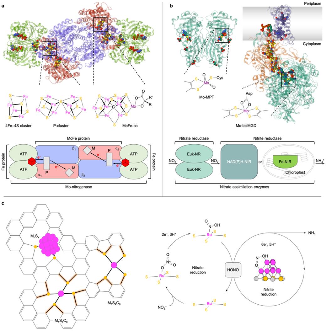 单原子催化剂(SACs)的合理设计已经成为多相催化的新兴领域。在众多最先进的SACs中,金属-硫-碳(M-S-C)材料成为最常见和最有代表性的材料,与天然酶的相似性使其在催化领域具有广阔的应用前景。研究表明,M-S-C材料的结构可调性高,在各种反应中具有潜在优势。然而,模拟天然酶的活性位点对于复杂的催化反应(如氨合成)仍是不够的。自然界中的氮固定和硝酸同化过程涉及复杂的酶系统,这些酶系统具有高度的结构和功能特异性。因此,理想的M-S-C催化剂应借鉴天然酶的结构特点,以实现更高效的催化性能。