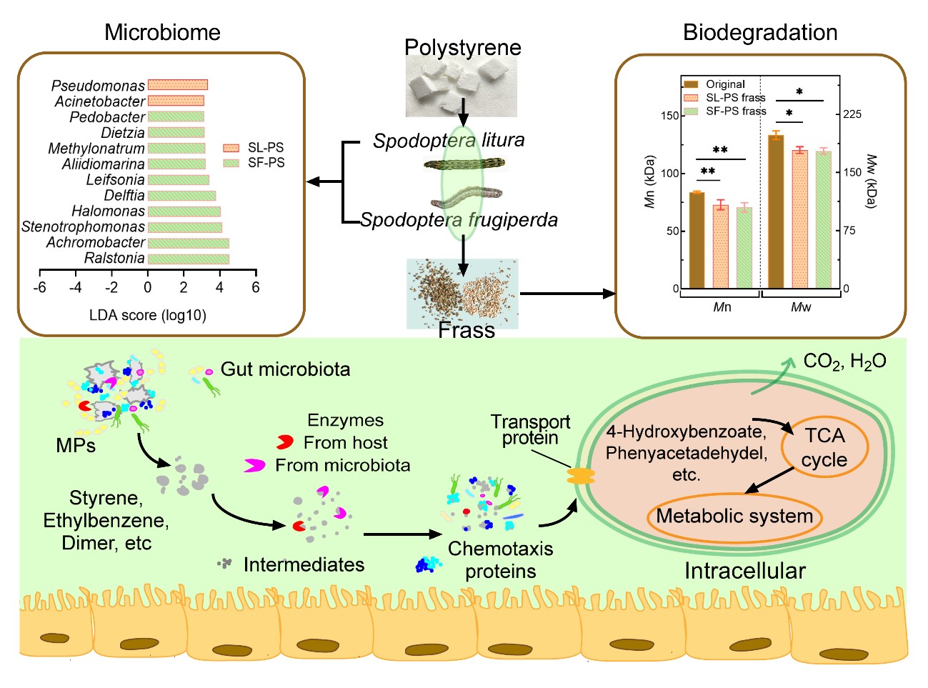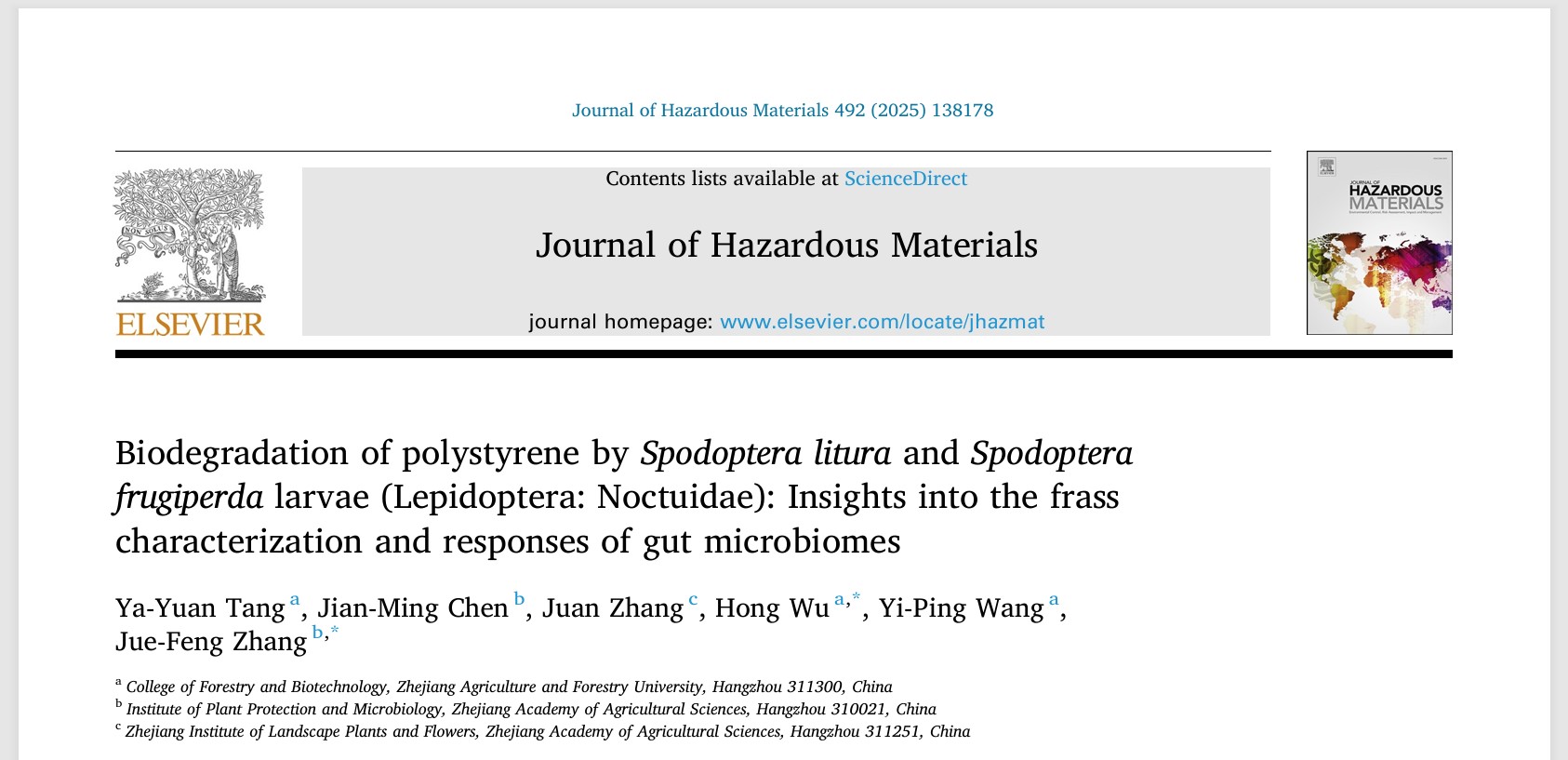 近日,林业与生物技术学院博士研究生唐娅媛在《Journal of Hazardous Materials》(危险材料杂志)(中科院环境科学与生态学1区Top, IF 12.2 )发表题为“Biodegradation of polystyrene bySpodoptera lituraandSpodoptera frugiperdalarvae (Lepidoptera: Noctuidae): Insights into the frass characterization and responses of gut microbiomes”(《斜纹夜蛾与草地贪夜蛾幼虫(鳞翅目:夜蛾科)对聚苯乙烯的生物降解:排泄物表征与肠道微生物组响应机制的研究》)的研究论文。林业与生物技术学院吴鸿教授及浙江省农业科学院植物与微生物研究所张珏锋副研究员为本文的共同通讯作者。beat365官方网站林业与生物技术学院为该论文第一单位和通讯作者单位。林业与生物技术学院王义平教授、浙江省农业科学院植物与微生物研究所陈建明研究员以及浙江省园林植物与花卉研究所张娟副研究员为共同作者。