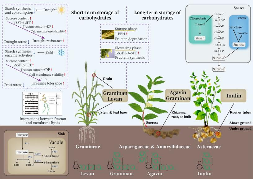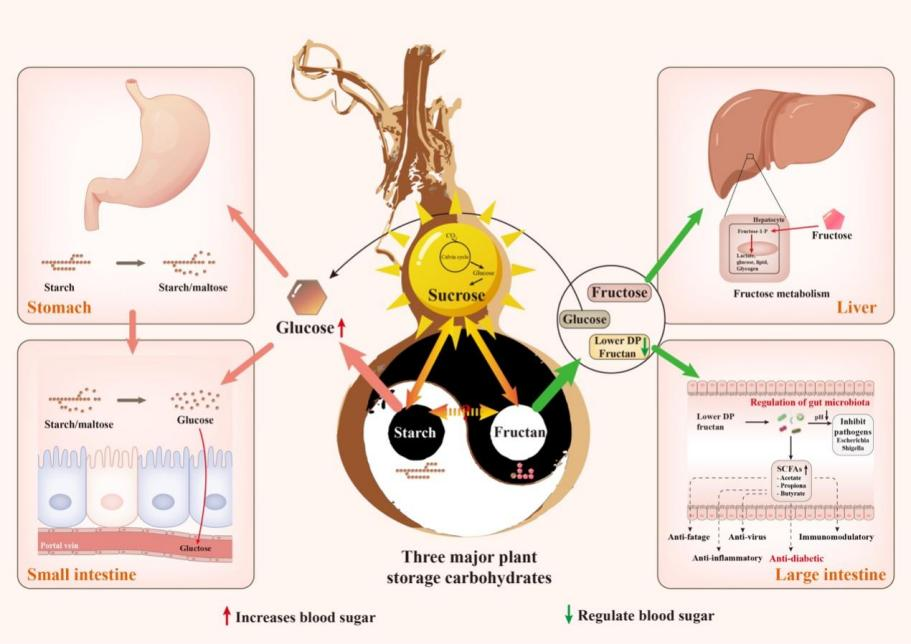 黄精是一种中国传统的食药同源物质,历史上一直被用作替代粮食植物。2021年,黄精石斛团队研究发现,黄精根茎不含淀粉,其核心营养功效物质果聚糖。果聚糖是三大植物储藏物质之一,在15%开花植物中存在,主要存在于禾本科植物(小麦、大麦、黑麦草、猫尾草和燕麦)、菊科植物(如菊苣和菊花)、石蒜科(大蒜、洋葱)和天门冬科(黄精、龙舌兰)中。天然果聚糖的代表性结构可根据蔗糖的位置和它们之间的果糖残基类型分为菊粉inulin、levan、graminan、neo-inulin、neo-levan、agavin 6种类类型,不同植物之间的结构和功能存在明显差异,黄精果聚糖是agavin型果聚糖(具有高度分支的(2/1)和(2/6)键,以及内部或末端葡萄糖单元),易降解,简单加工后可产生46.1%的单糖和二糖,与菊粉为代表的商业果聚糖(膳食纤维)存在本质的区别,纠正了传统上认为黄精主要依靠淀粉获取能量供应的错误观点,明确黄精果聚糖具有能量供应与慢性病预防的双重功能。