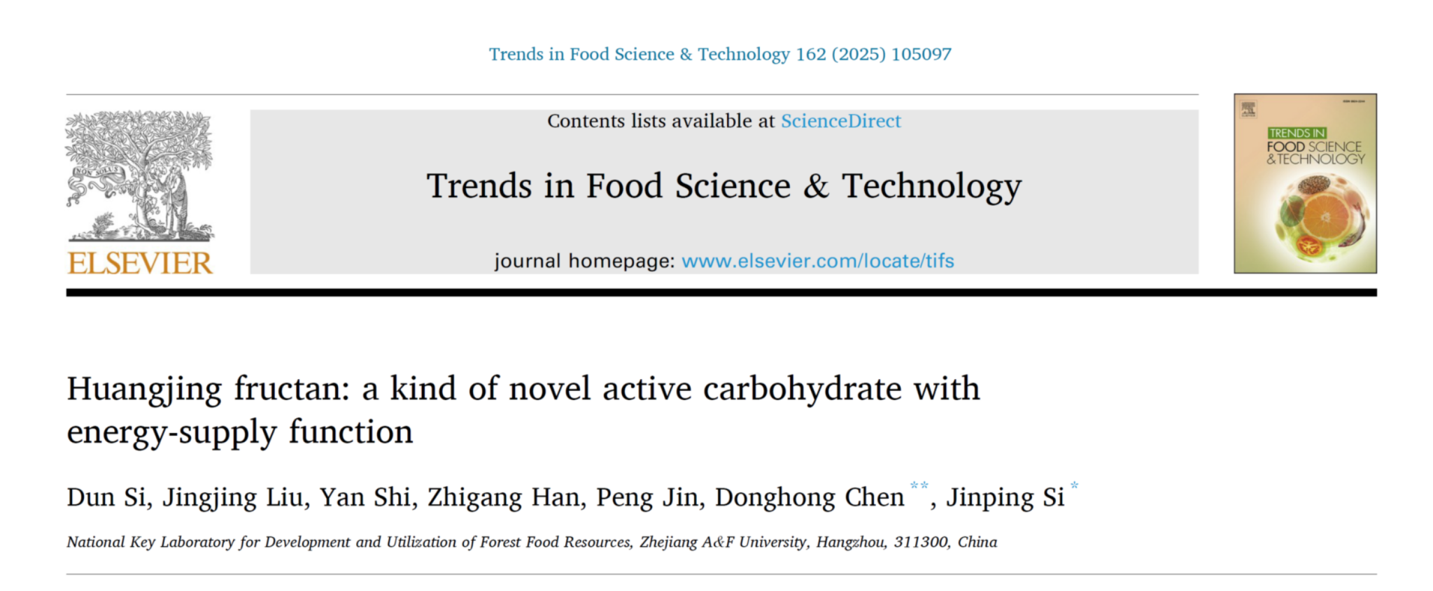近日,森林食物资源挖掘与利用全国重点实验室黄精石斛团队,在在国际权威学术期刊《Trends in Food Science & Technology》(中科院1区Top,IF-5yr=16.4)发表题目为“Huangjing fructan: a kind of novel active carbohydrate with energy-supply function”(《黄精果聚糖:一种具有能量供应与疾病防治双重功能的新型碳水化合物》)的论文,从黄精果聚糖结构-功能-能量代谢关联性,提出黄精果聚糖有别于传统果聚糖的颠覆性认知。