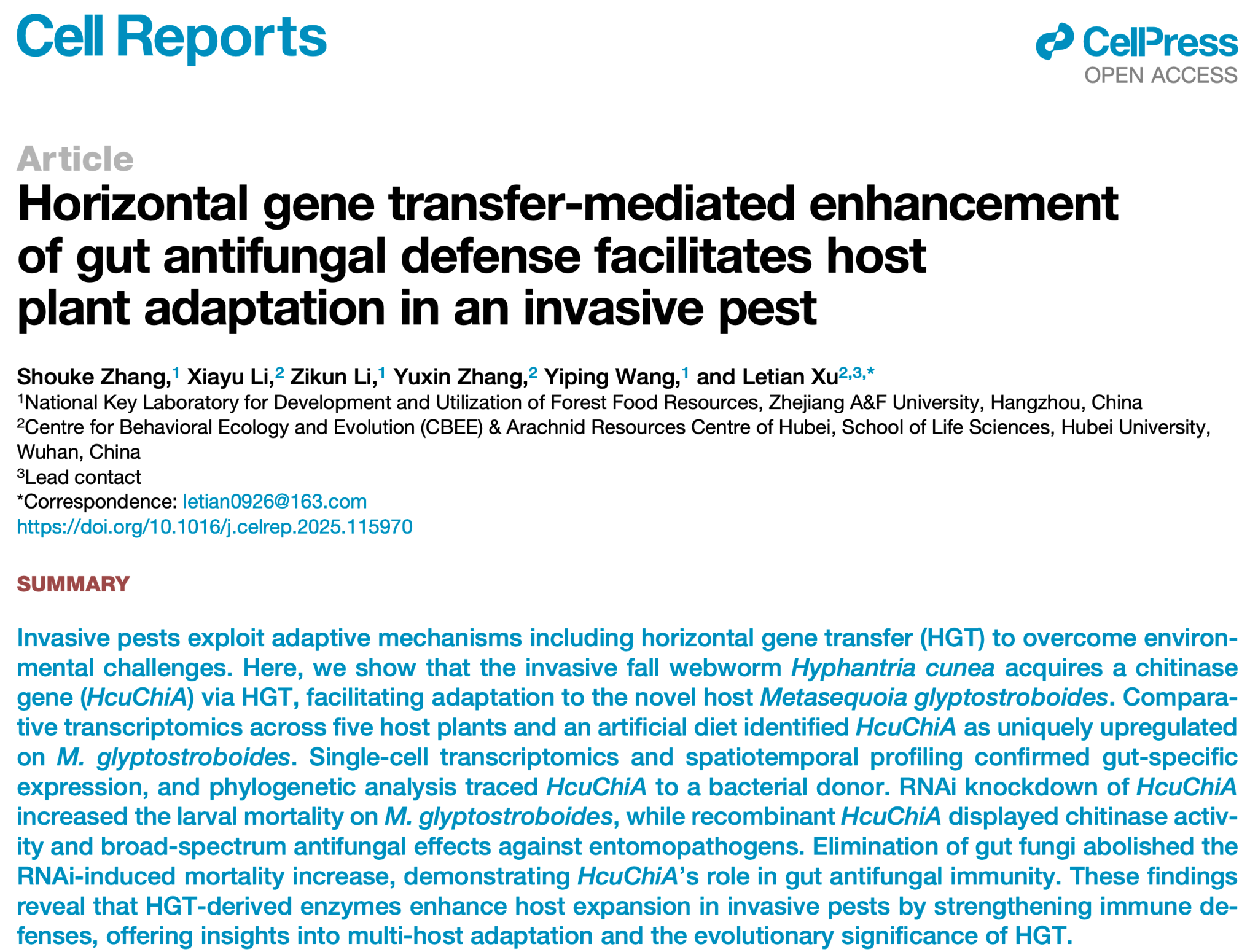 近日,林生院森保学科张守科副教授在Cell子刊《Cell Reports》(中科院1区,TOP)发表题为《Horizontal gene transfer mediated enhancement of gut antifungal defense facilitates host plant adaptation in an invasive pest》(《水平基因转移介导的肠道抗真菌防御增强有助于入侵害虫对寄主植物的适应》)的研究论文。