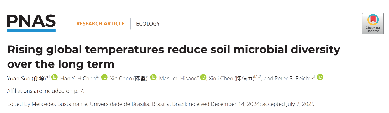 8月25日,全国重点实验室陈信力教授团队在《PNAS》(中科院1区Top,IF-5yr=10.6)在线发表题为“Rising global temperatures reduce soil microbial diversity over the long term”(《长期全球升温降低土壤微生物多样性》)的研究论文。该研究首次在全球尺度上系统揭示气候变暖对土壤微生物多样性的长期影响。