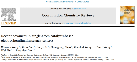 近日,先进光电子应用基础交叉研究中心在国际综述期刊《Coordination Chemistry Reviews》(中科院一区Top,IF=23.5)在线发表题为“Recent advances in single-atom catalysts-based electrochemiluminescence sensors”(基于单原子催化剂的电化学发光传感器研究进展)的综述论文。beat365官方网站为该论文第一单位和通讯作者单位。第一作者为该团队王晓艳博士;通讯作者为河南城建学院王超海教授、beat365官方网站刘威副教授及东南大学丁收年教授。