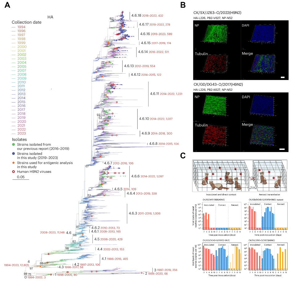 该研究基于2019至2023年间我国禽类中优势流行的低致病性H9N2禽流感病毒基因组的分子特征及其演变规律,提出了H9N2病毒的演化分型理论,建立了一套适用于该病毒基因进化分支与基因型划分的命名标准,并明确当前我国家禽中H9N2病毒遗传与抗原特性的高度复杂性和多样性是导致防控效果不佳的主要原因。研究进一步发现,H9N2病毒通过多位点突变不仅可能增强其在哺乳动物体内的复制能力与传播效率,还可能协助病毒逃逸宿主免疫清除;且携带上述关键突变的毒株比例呈上升趋势,提示该病毒具有潜在的公共卫生风险。本研究结果对禽流感疫苗的研发和疫情风险预警具有重要的指导价值。