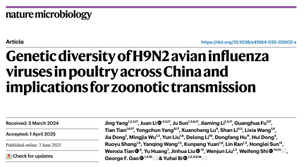 近日,动科动医学院杨永春副教授与中国科学院微生物研究所毕玉海研究员、高福院士,以及上海交通大学医学院附属瑞金医院史卫峰教授合作,在《Nature》旗下微生物学顶级期刊《Nature Microbiology》(中科院1区,TOP,IF5=20.7)发表了题为《Genetic diversity of H9N2 avian influenza viruses in poultry across China and implications for zoonotic transmission》的研究论文。